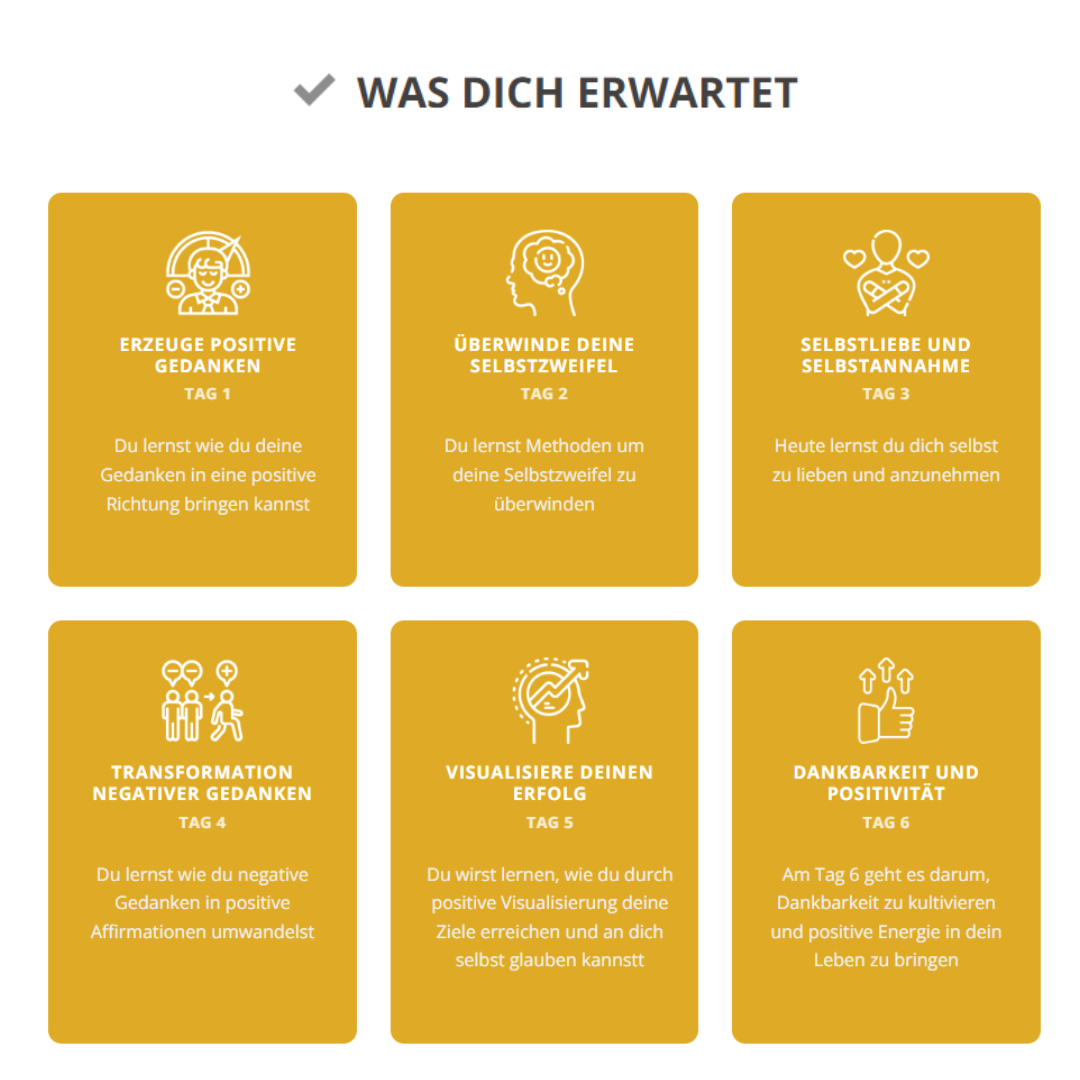 WAS DICH ERWARTETTAG 1 – ERZEUGE POSITIVE GEDANKENDu lernst wie du deine Gedanken in eine positive Richtung bringen kannst. TAG 2 – ÜBERWINDE DEINE SELBSTZWEIFELDu lernst Methoden um deine Selbstzweifel zu überwinden TAG 3 – SELBSTLIEBE UND SELBSTANNAHMEHeute lernst du dich selbst zu lieben und anzunehmen TAG 4 – TRANSFORMATION NEGATIVER GEDANKENDu lernst wie du negative Gedanken in positive Affirmationen umwandelst TAG 5 – VISUALISIERE DEINEN ERFOLGDu wirst lernen, wie du durch positive Visualisierung deine Ziele erreichen und an dich selbst glauben kannst TAG 6 – DANKBARKEIT UND POSITIVITÄTAm Tag 6 geht es darum, DANKBARKEIT zu kultivieren und positive Energie in dein Leben zu bringen TAG 7 – ABSCHLUSS UND AUSBLICKIntegration aller Lerninhalte in den Alltag und Ausblick auf ein erfülltes und positives Leben