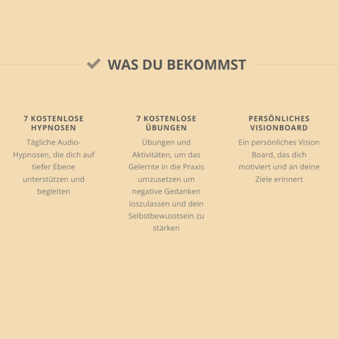 In Form von: 7 KOSTENLOSEN AUDIO-HYPNOSEN zum Herunterladen 7 KOSTENLOSEN ÜBUNGEN