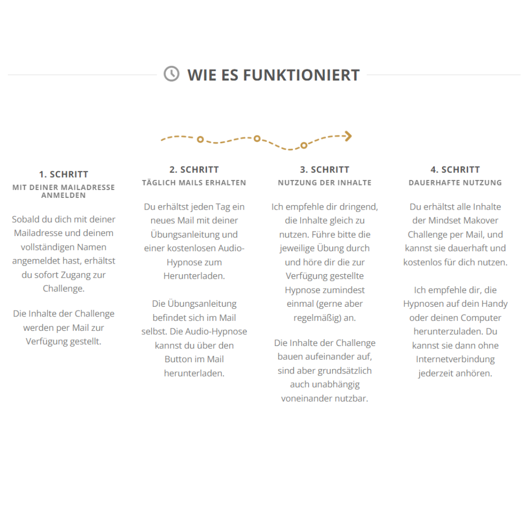 WAS DU TUN MUSSTDich mit deinem vollständigen Namen und deiner Mailadresse anmelden. Täglich 20 Minuten in dich und deine Transformation investieren.